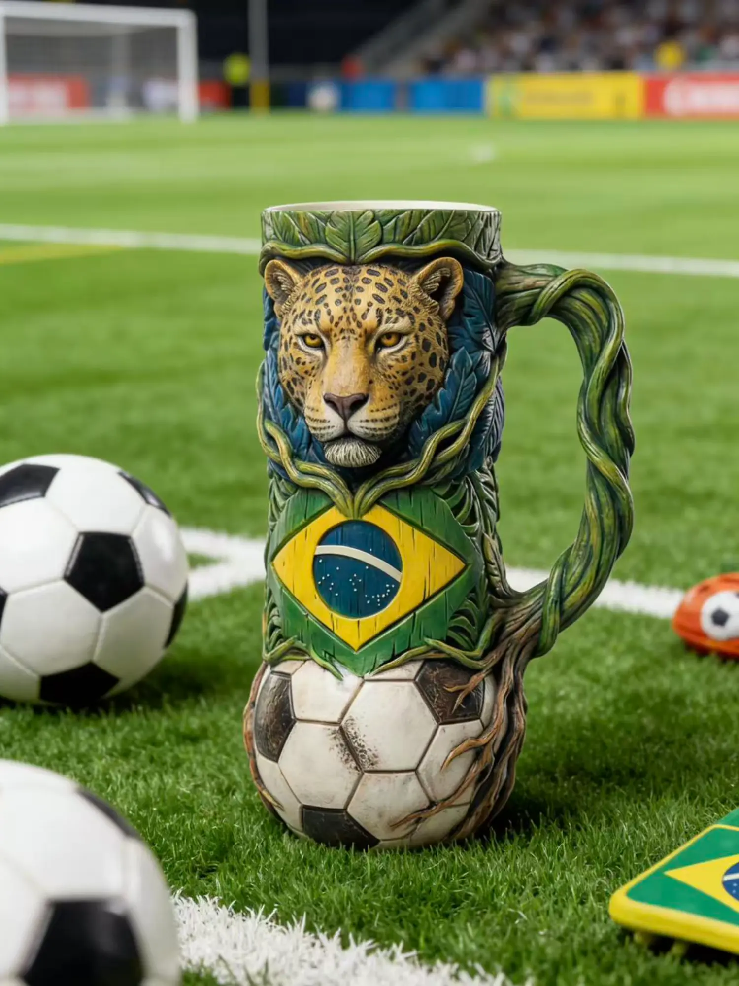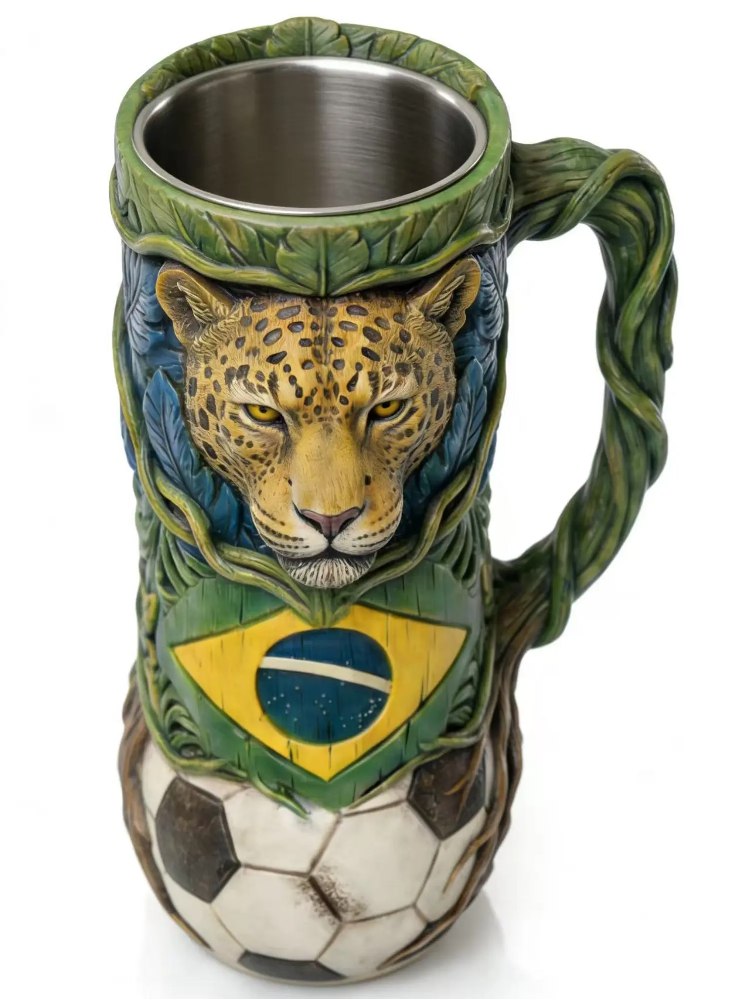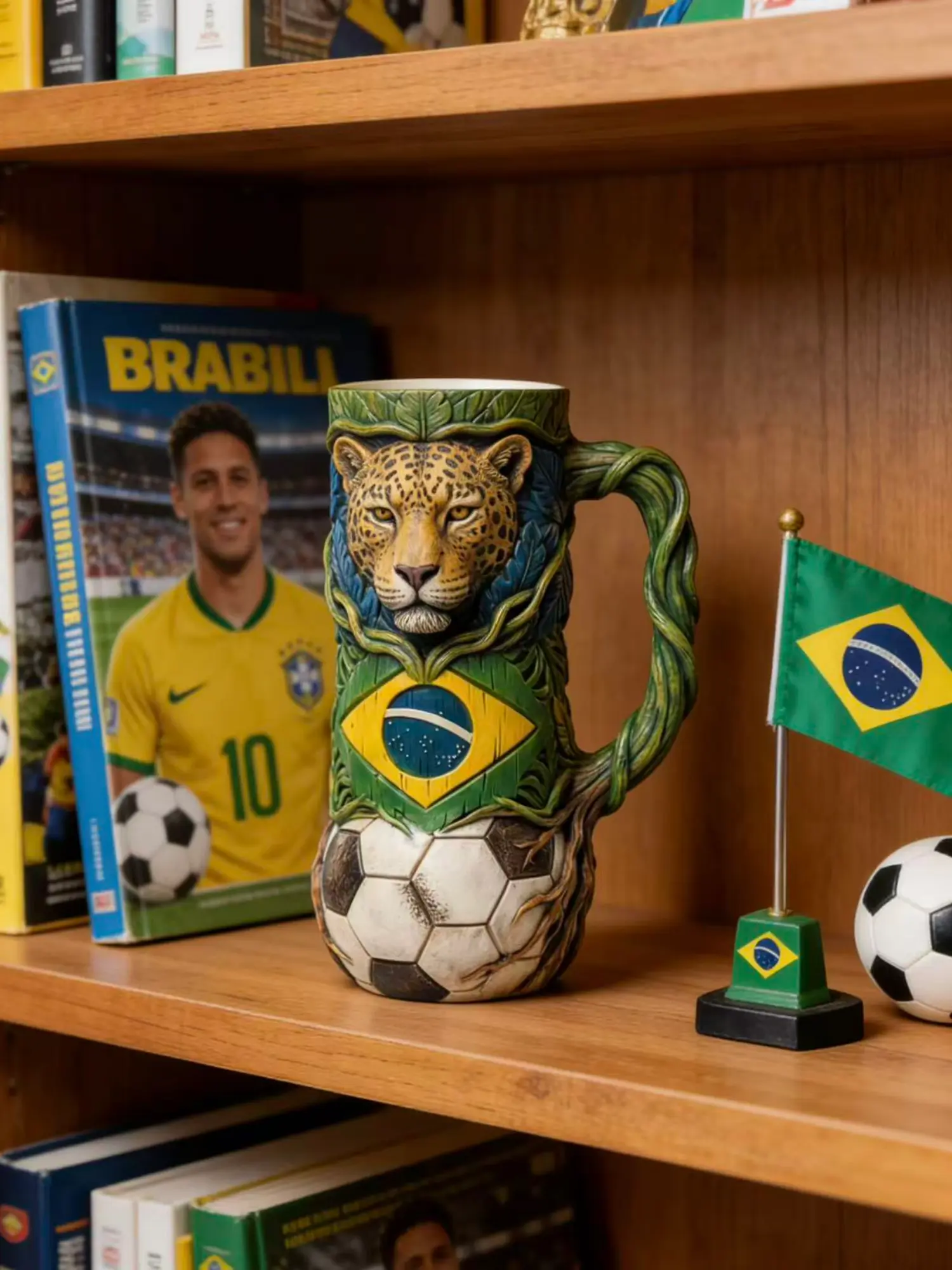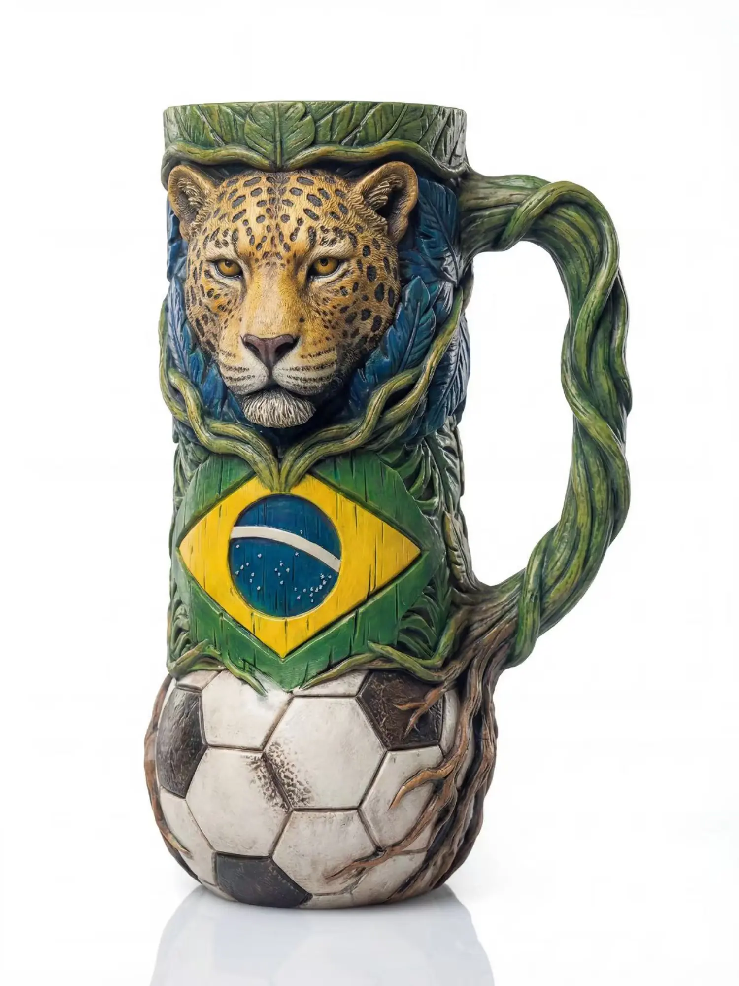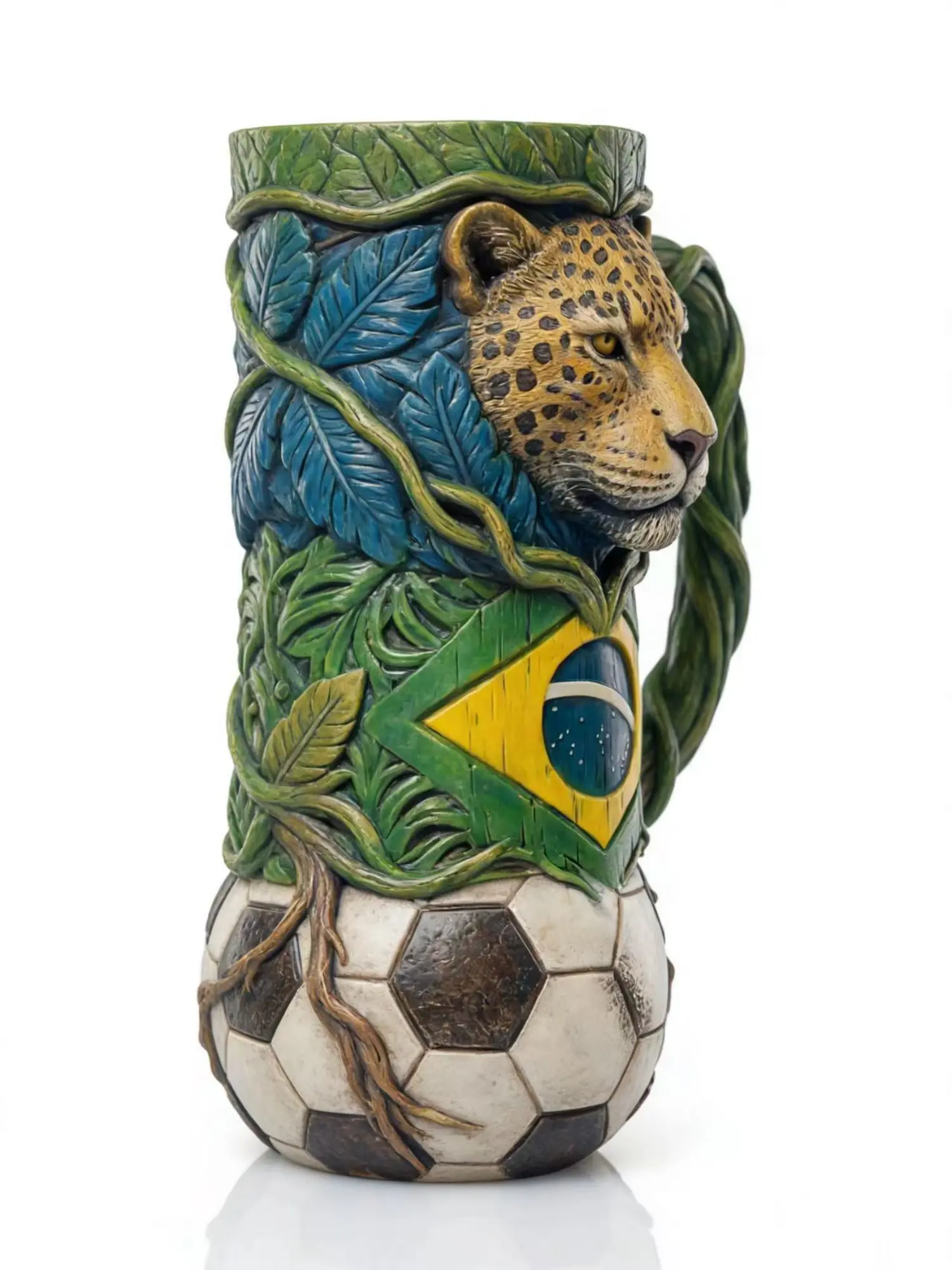 - Symbols of Brazilian Soul: The iconic yellow, green, and blue Brazilian flag is embedded beneath the jaguar, supported by a realistic football at the base, celebrating the “Football Kingdom.”
