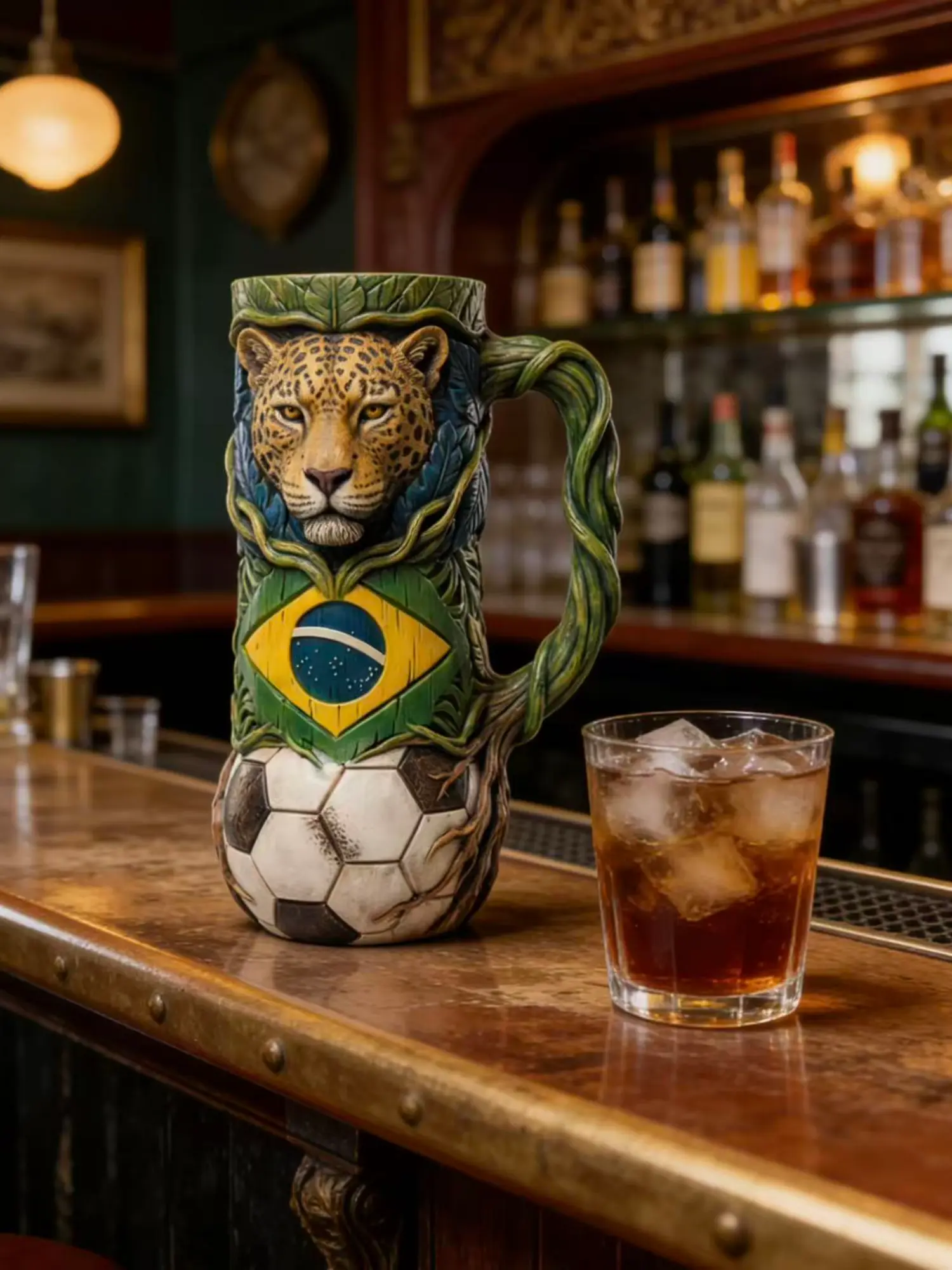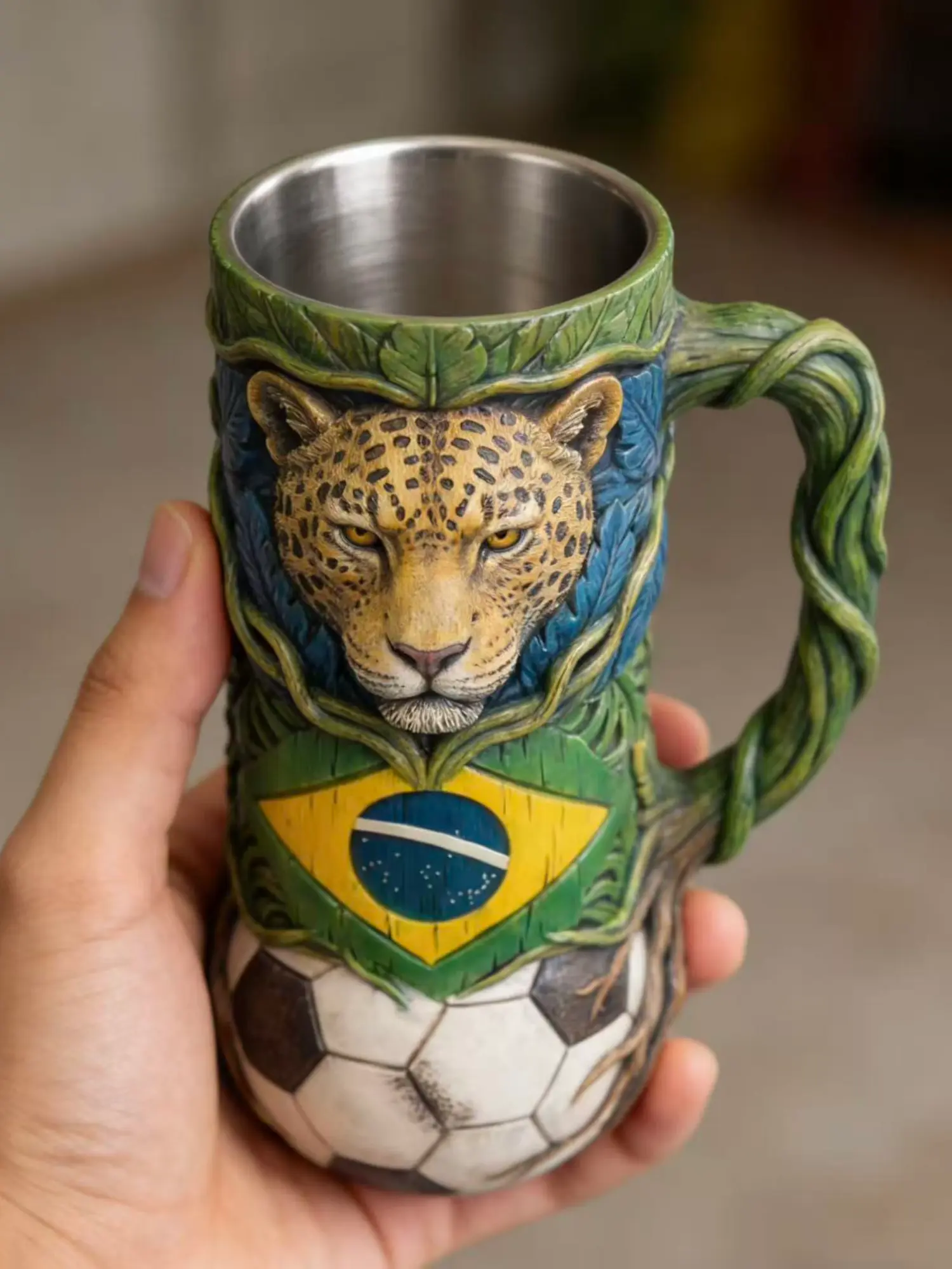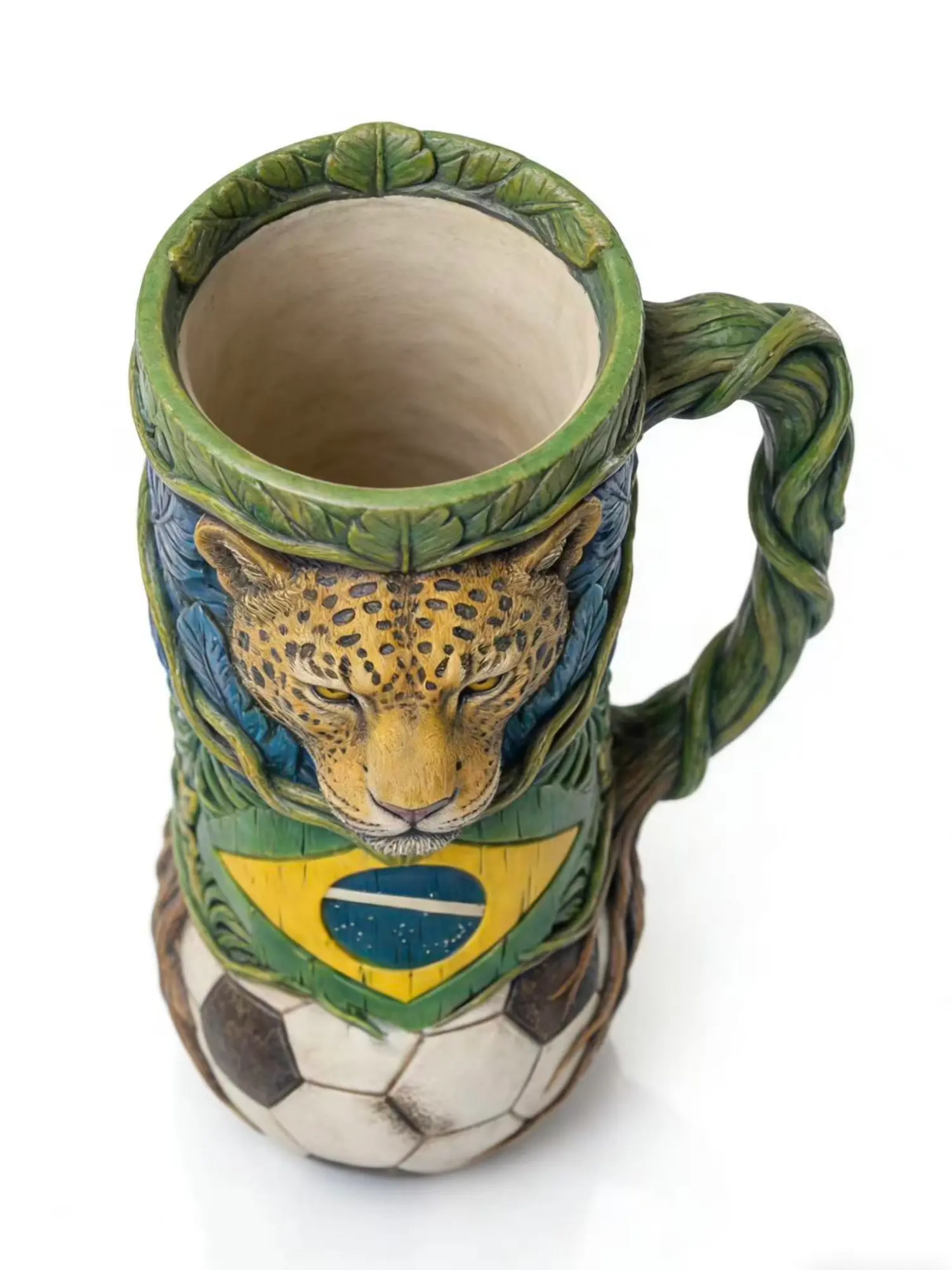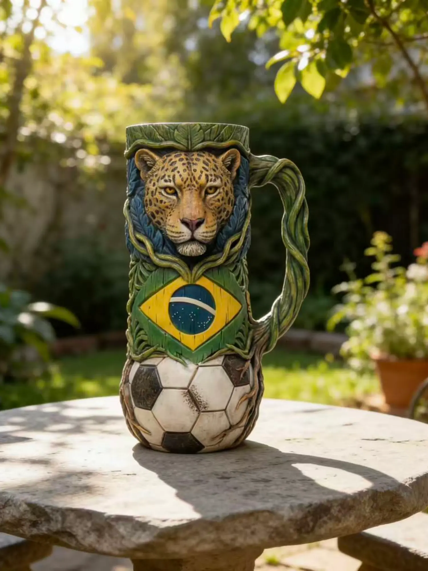 - Symbols of Brazilian Soul: The iconic yellow, green, and blue Brazilian flag is embedded beneath the jaguar, supported by a realistic football at the base, celebrating the “Football Kingdom.”