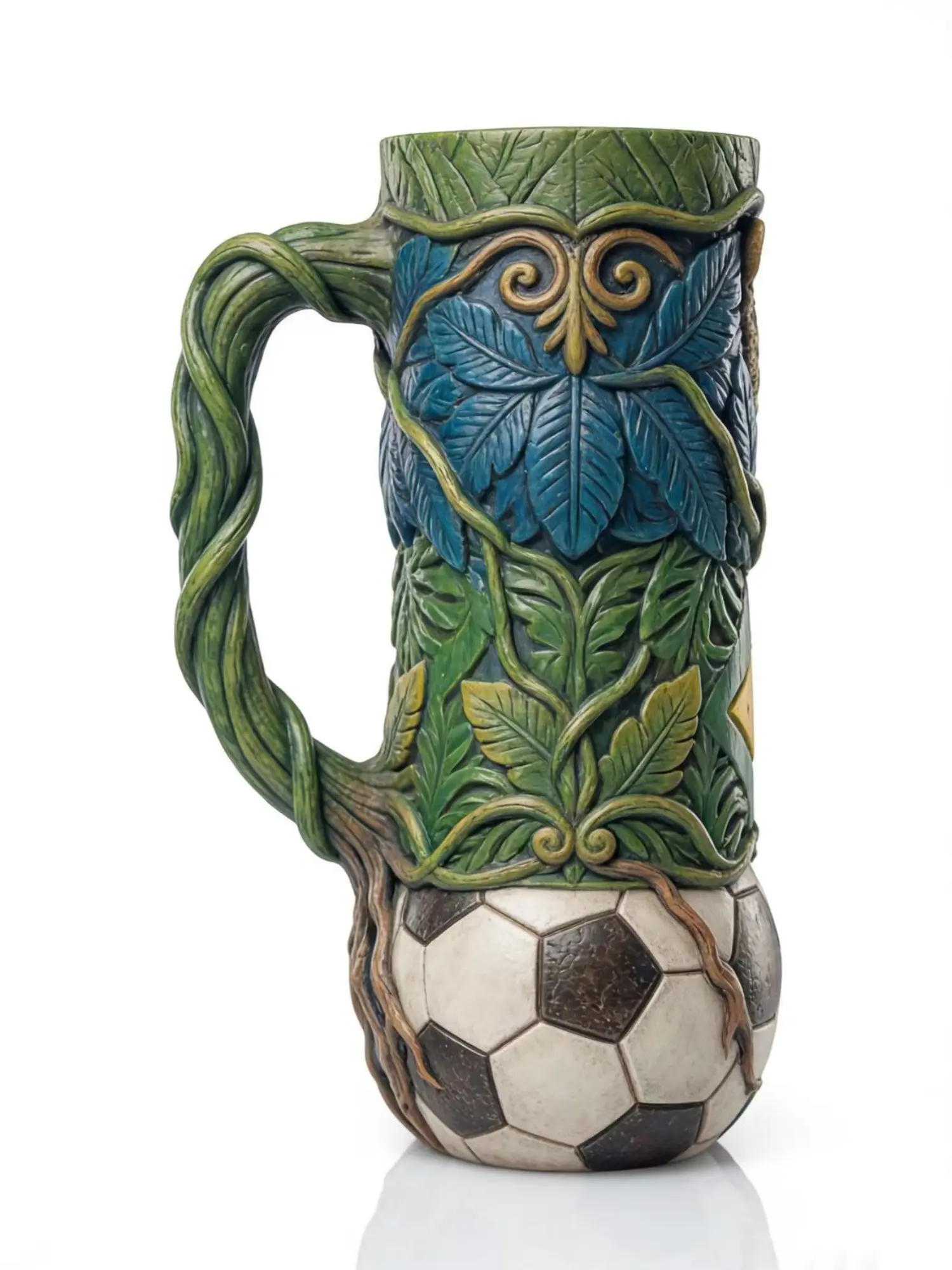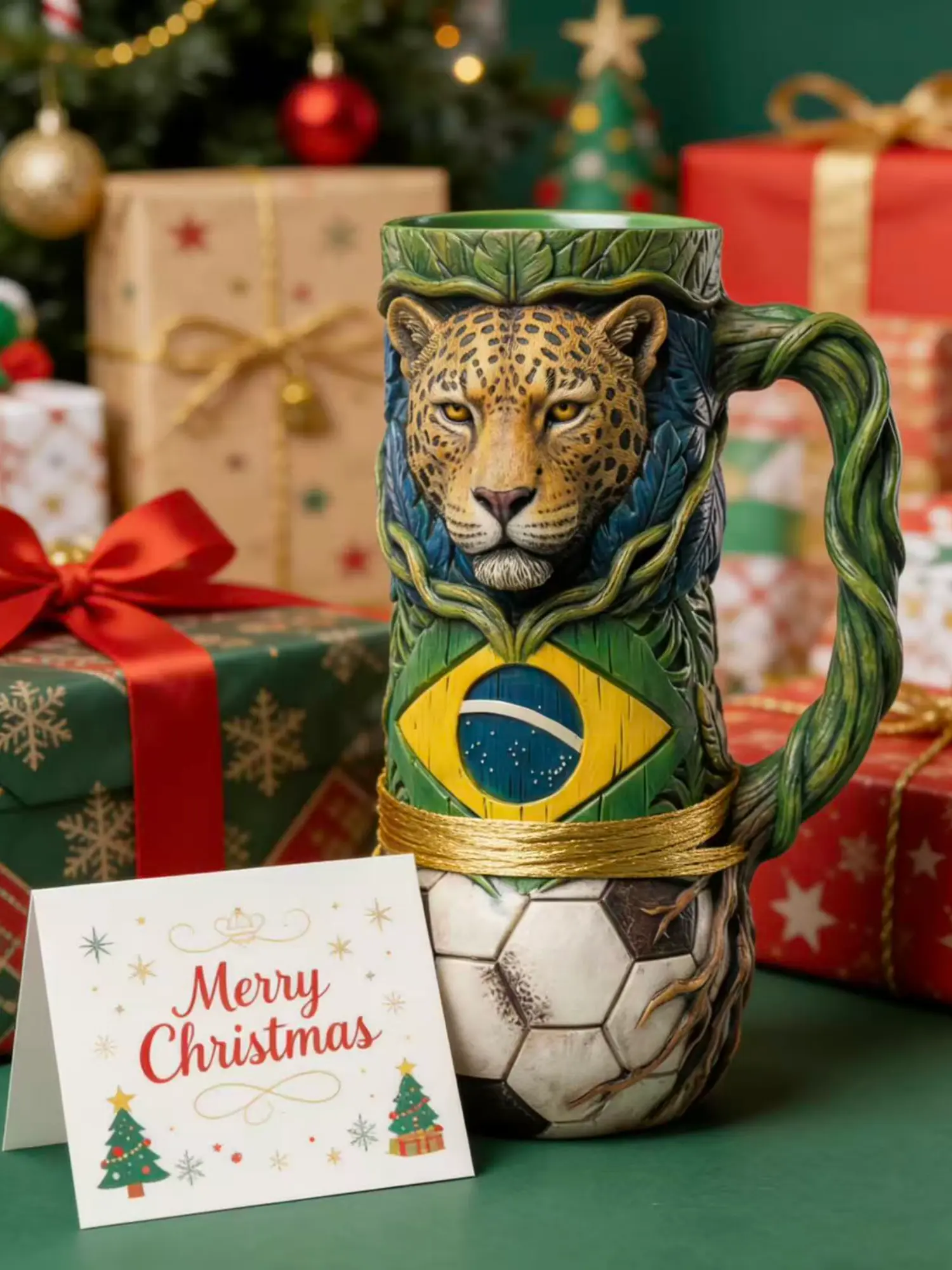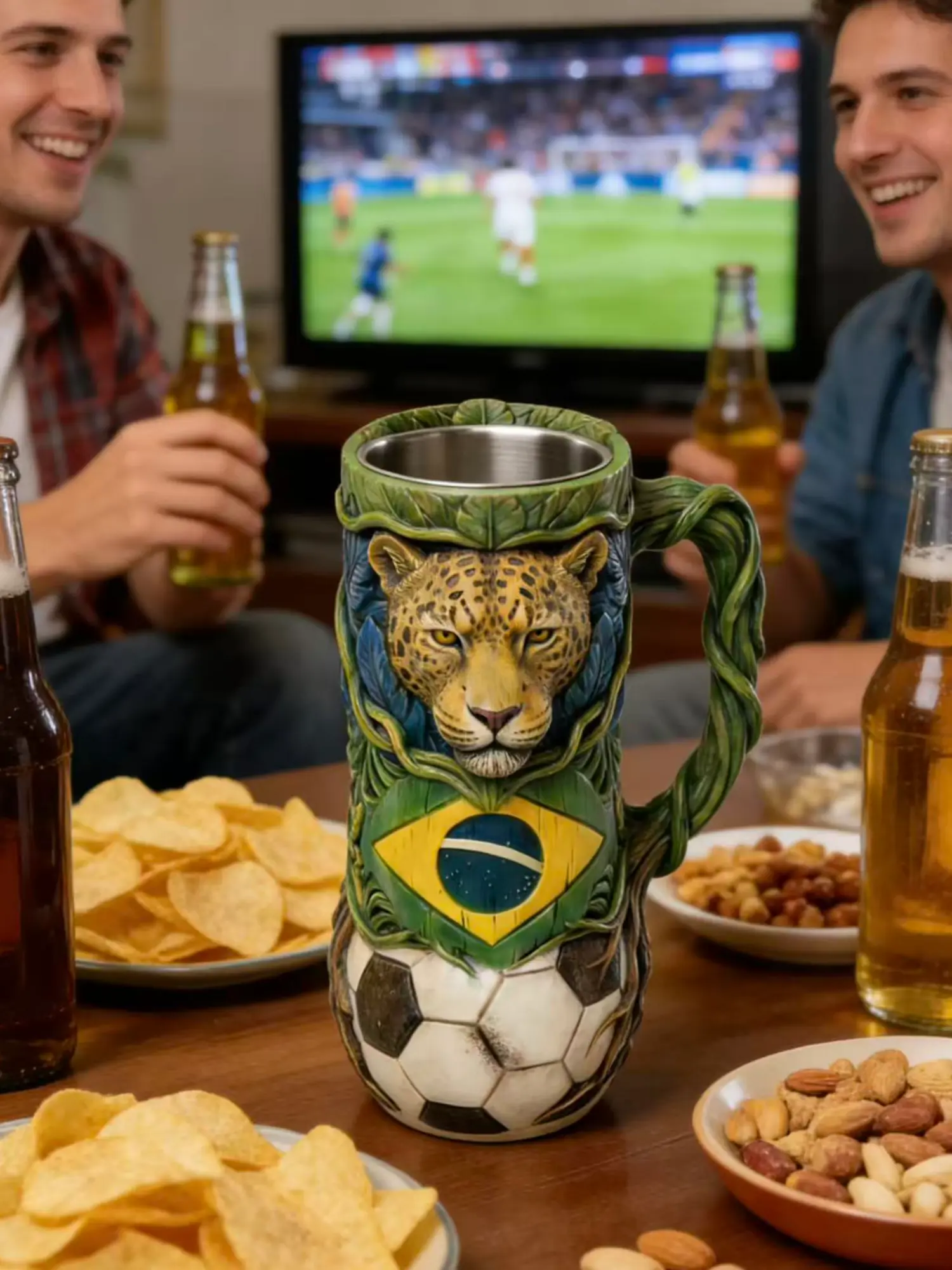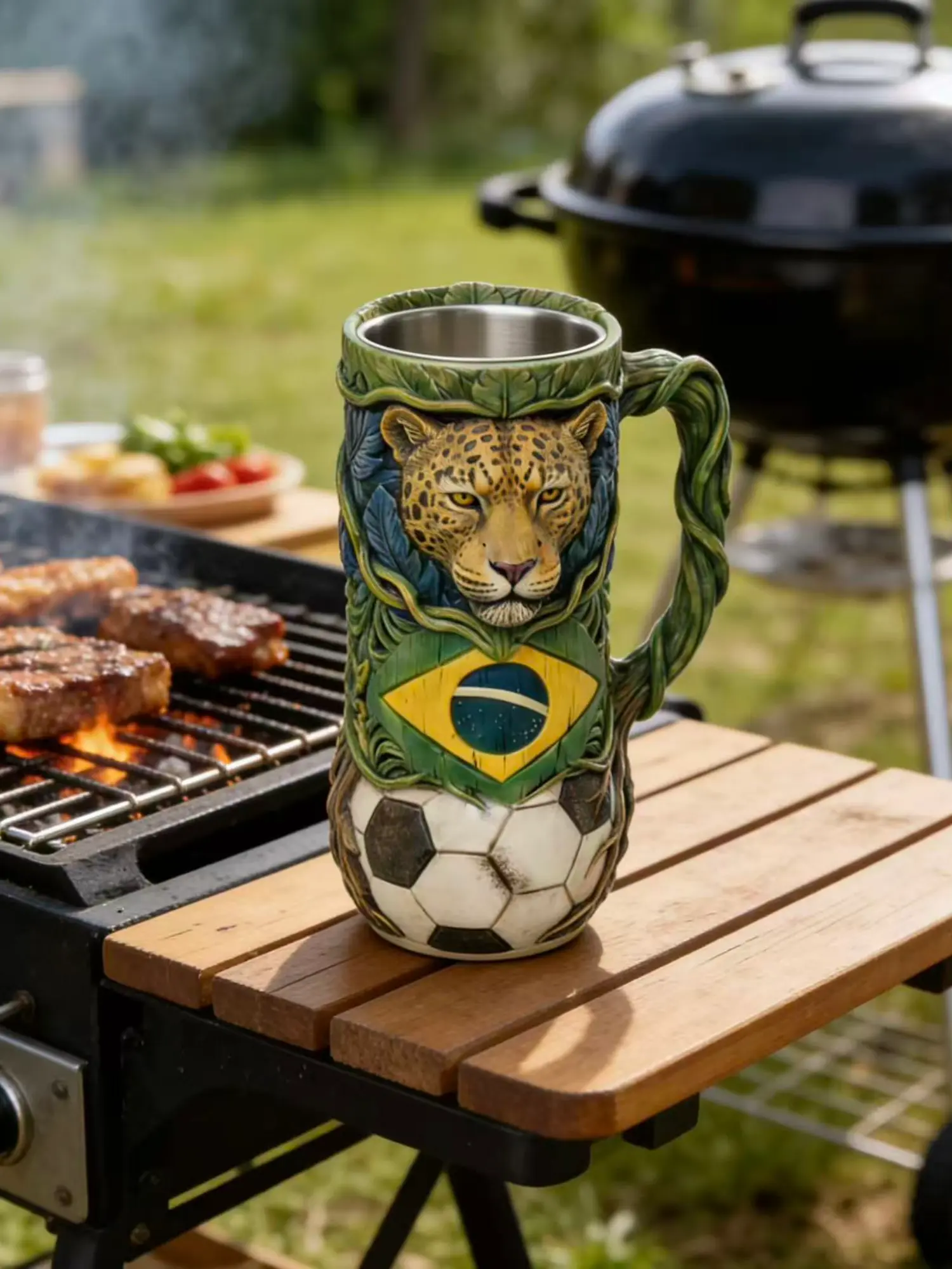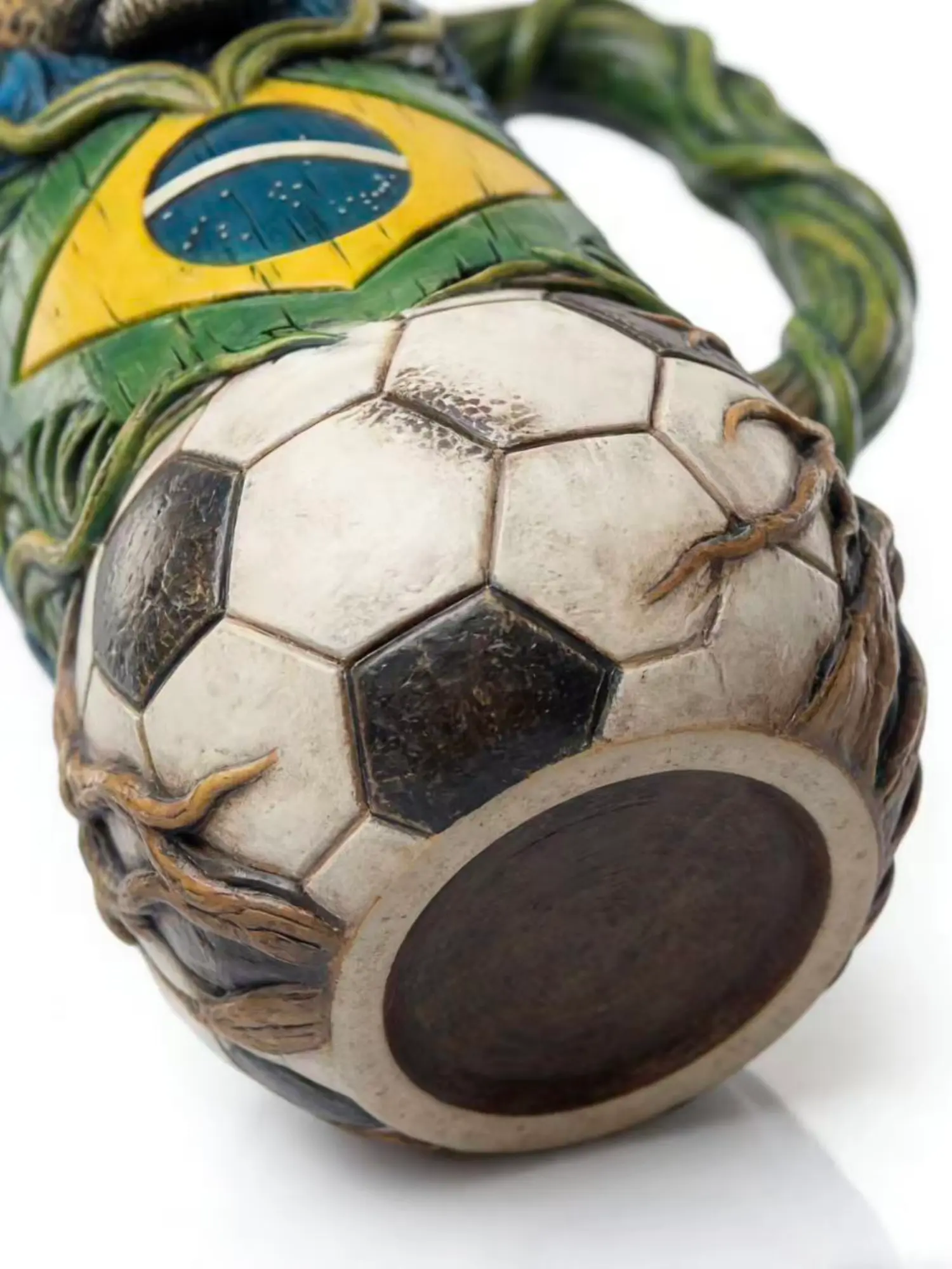 - Symbols of Brazilian Soul: The iconic yellow, green, and blue Brazilian flag is embedded beneath the jaguar, supported by a realistic football at the base, celebrating the “Football Kingdom.”